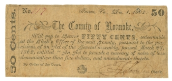 1862 County of Roanoke Salem Virginia VA 50c Scrip (66018)