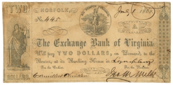 1862 Exchange Bank of Virginia, Norfolk, VA $2 Obsolete Note No.445 (L1829)