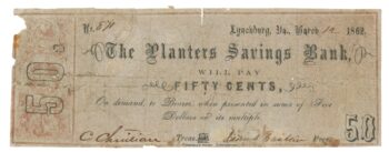 1862 Planters Savings Bank, Lynchburg, Virginia 50c Obsolete Note No.871 (60112)