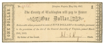 1862 County of Washington Abingdon Virginia VA $1 Obsolete Note – Civil War Era