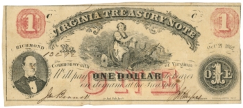 1862 Virginia Treasury Note $1 VA CR-18 (L2743)