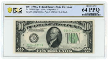 1934A $10 Federal Reserve Note Cleveland FR-2006D PCGS UNC 64PPQ (64045)