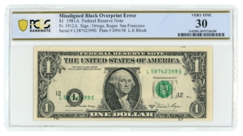 1981A $1 FRN Misaligned Black Overprint Error PCGS VF30 (L6236)