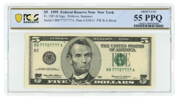 1999 $5 FRN New York FR-1987B PCGS AU55 PPQ