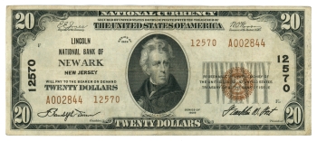 1929 Ty2 Lincoln National Bank Newark NJ $20 Note Ch#12570 (66433)