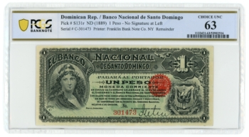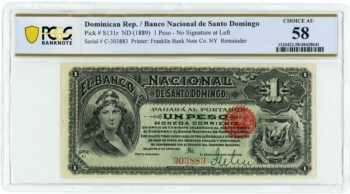 1889 Banco Nacional de Santo Domingo Dominican Rep 1 Peso PCGS 63 S-131r (65714)