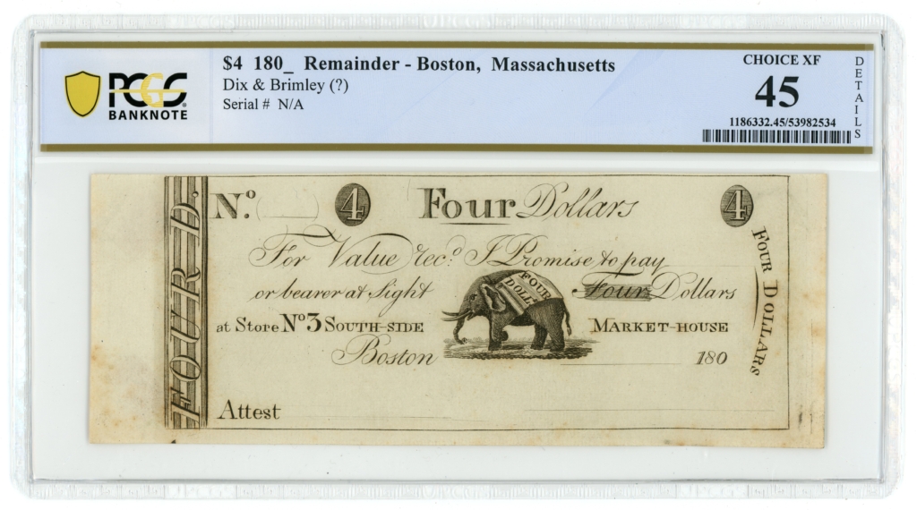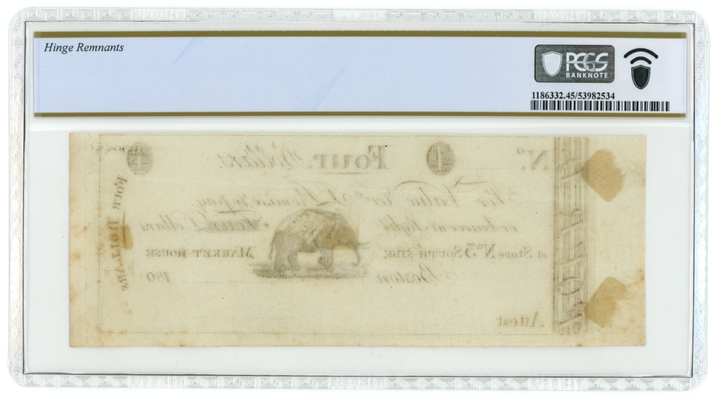 Remainder note. Issuer unknown but likely Dix & Brinley. Typo on the holder regarding the potential issuers name. “I Promise to pay ___ or bearer at sight Four Dollars at Store No.3 South-Side Market-House, Boston.” Very rare note. Hinge remnants notated on the back of the holder.