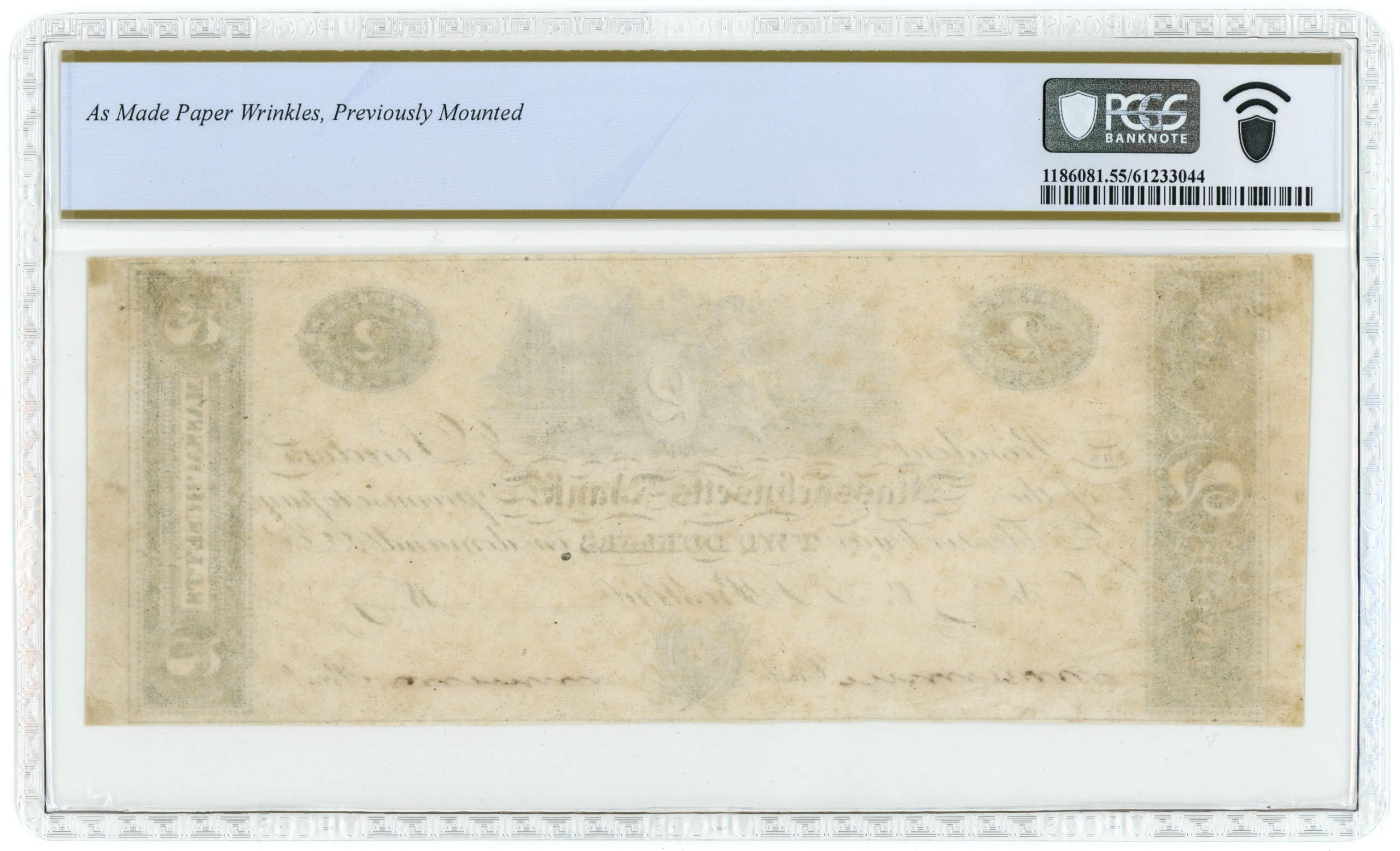 Haxby MA270-G86. This note is the plate note in Haxby’s reference. Abner Reed imprint. As made paper wrinkles; previously mounted notated on the holder.