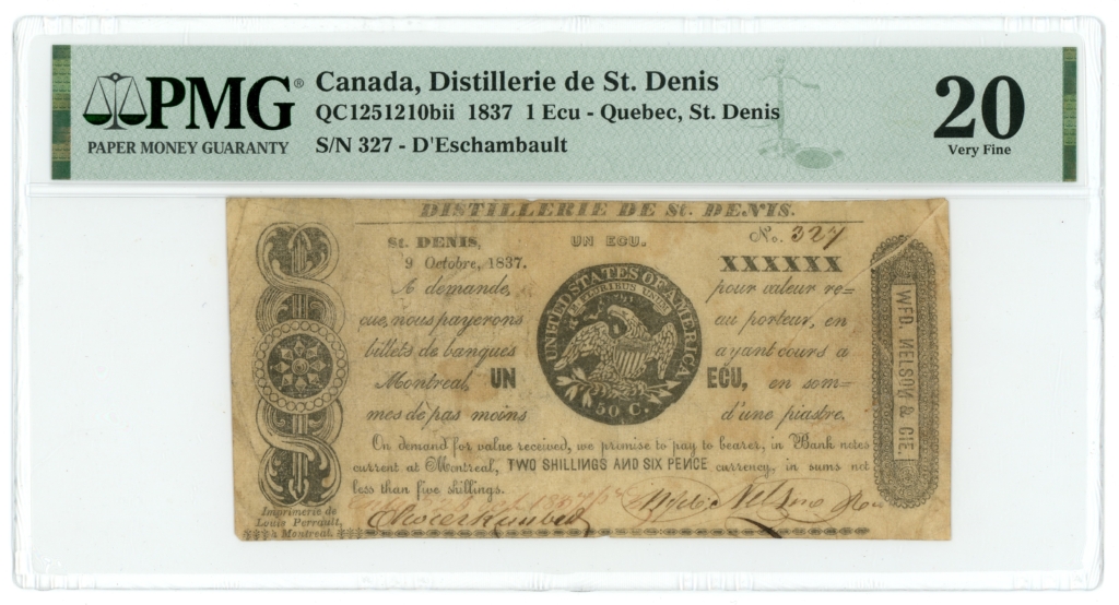 Graham QC1251210bii. Imprint: Louis Perrault, Montreal. “On demand for value received, we promise to pay to bearer, in Bank notes current at Montreal, Two shillings & six pence currency, in sums not less than five shillings.” Internal tear notated on the back of the holder.