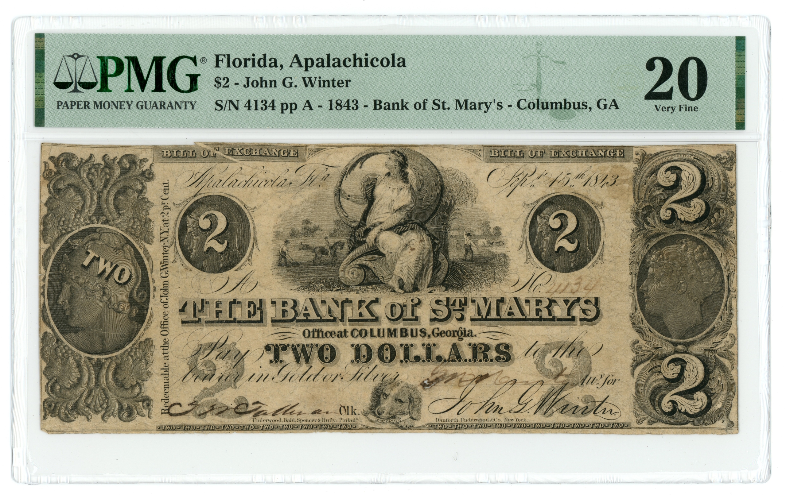 1843 John G. Winter Apalachicola FL at Bank of St. Marys Columbus GA $2 PMG 20