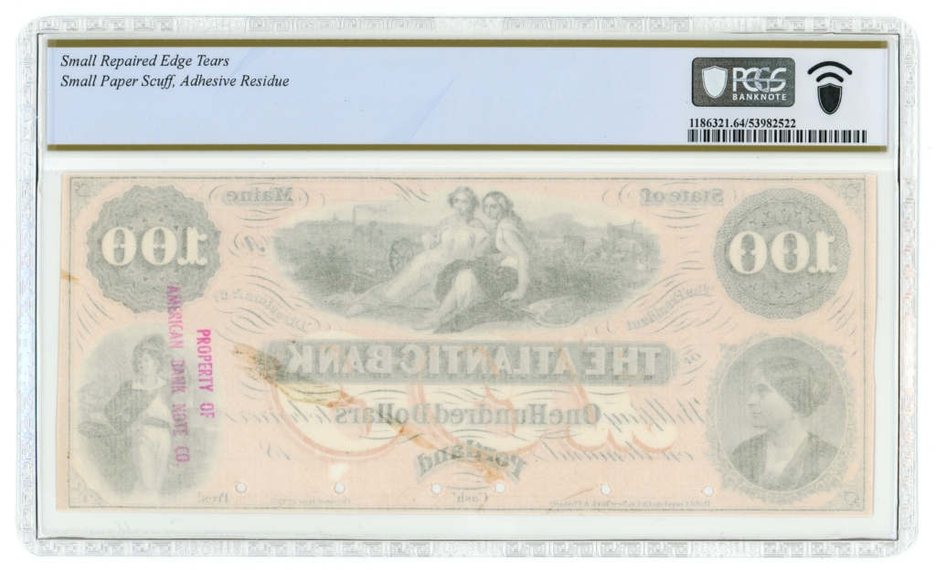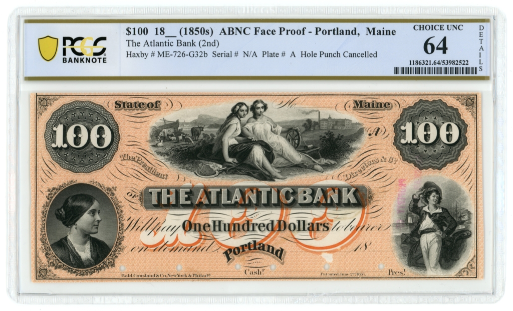 1850s Atlantic Bank Portland Maine ME $100 Proof Note PCGS UNC 64 Details 65670
