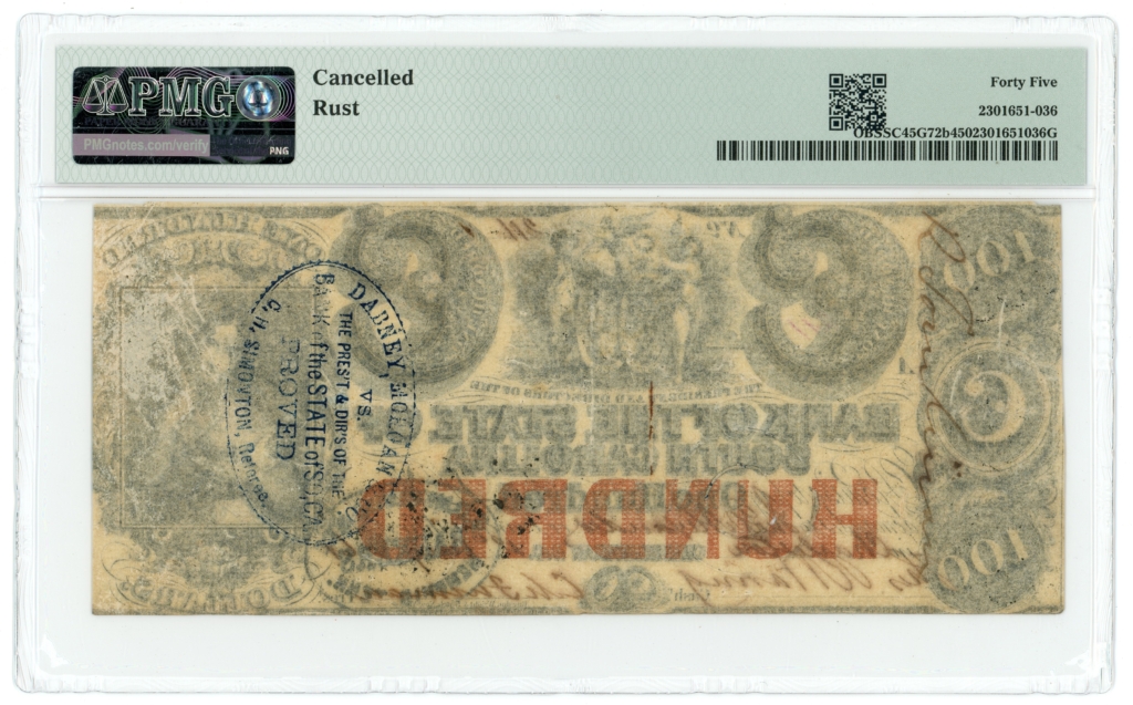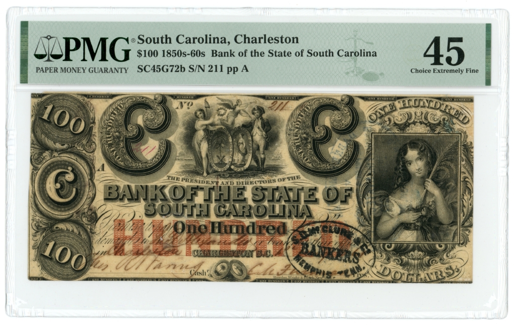 Haxby SC45-G72b. Sheheen 605; Rarity 7. Cut canceled. Note has rust as attributed on the holder. Memphis bankers stamp on the front of the note.