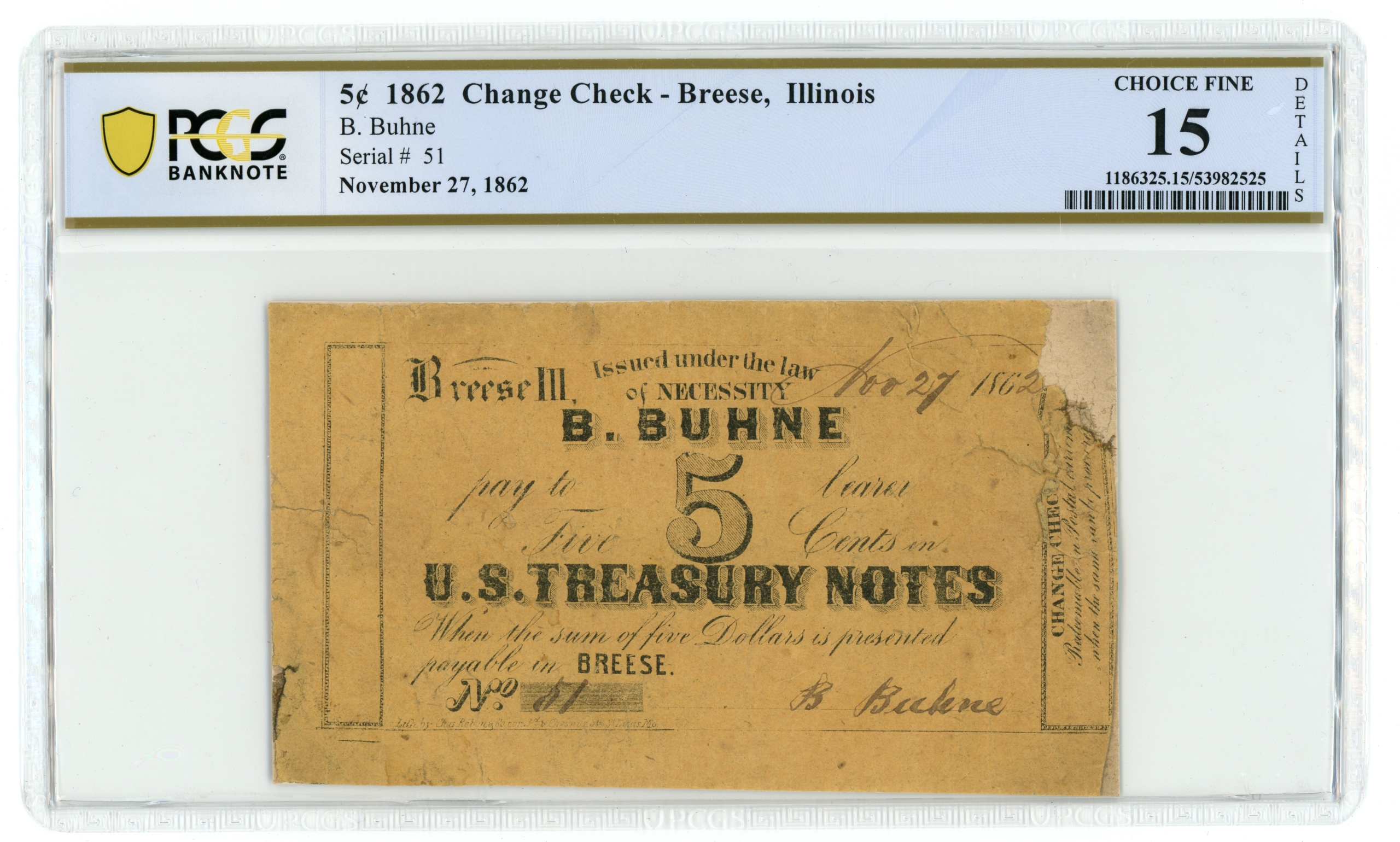 1862 B Buhne Breese Illinois IL 5c Scrip (Change Check) PCGS 15 Details RARE