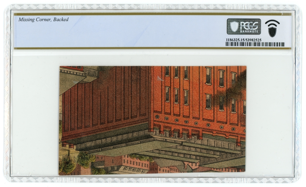 Missing corner; backed notated on the back of the holder. Payable in US Treasury Notes when the sum of $5 is presented. Payable in Breese IL. “Lith by Chas Robin. & Co. con. 3rd & Chestnut Sts., St. Louis MO.