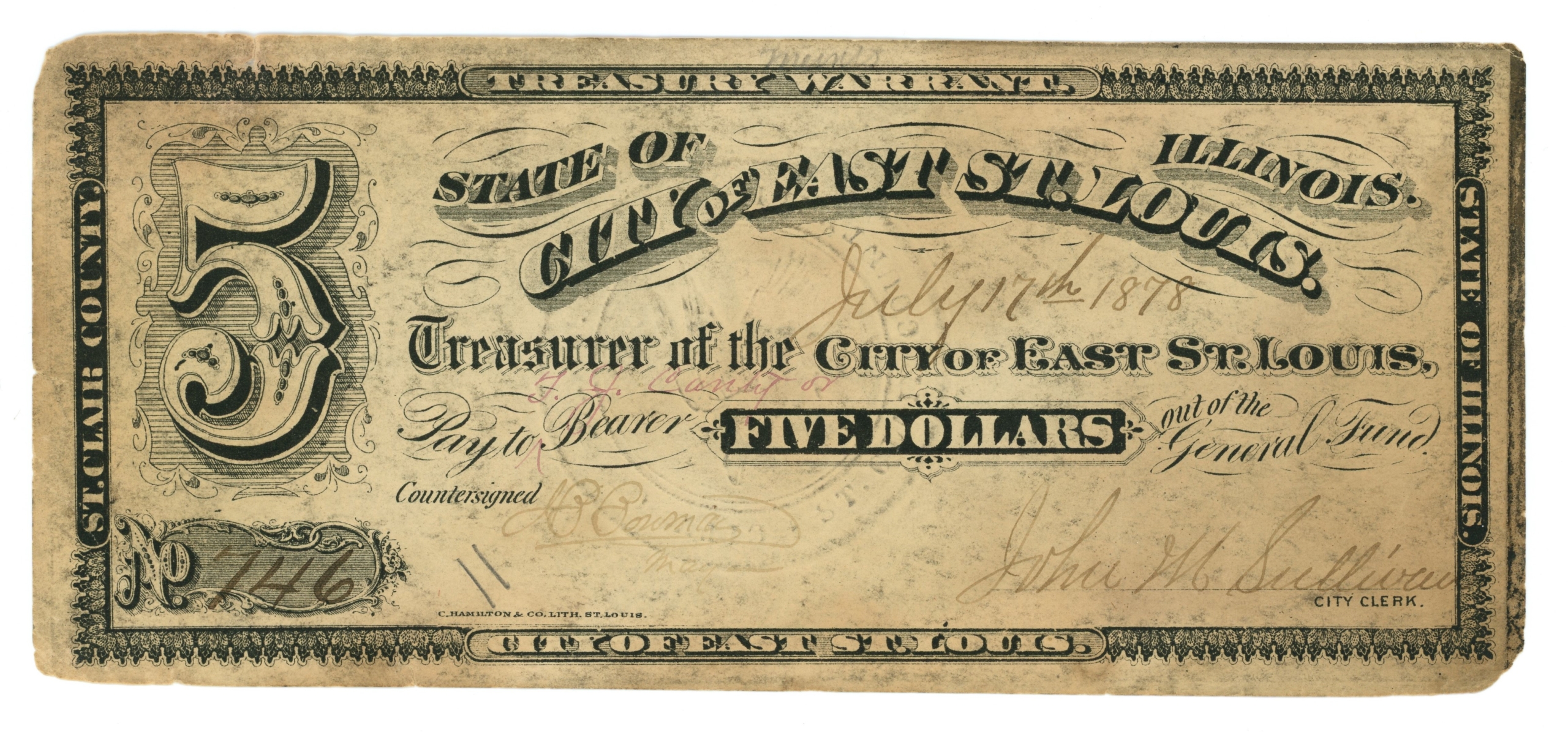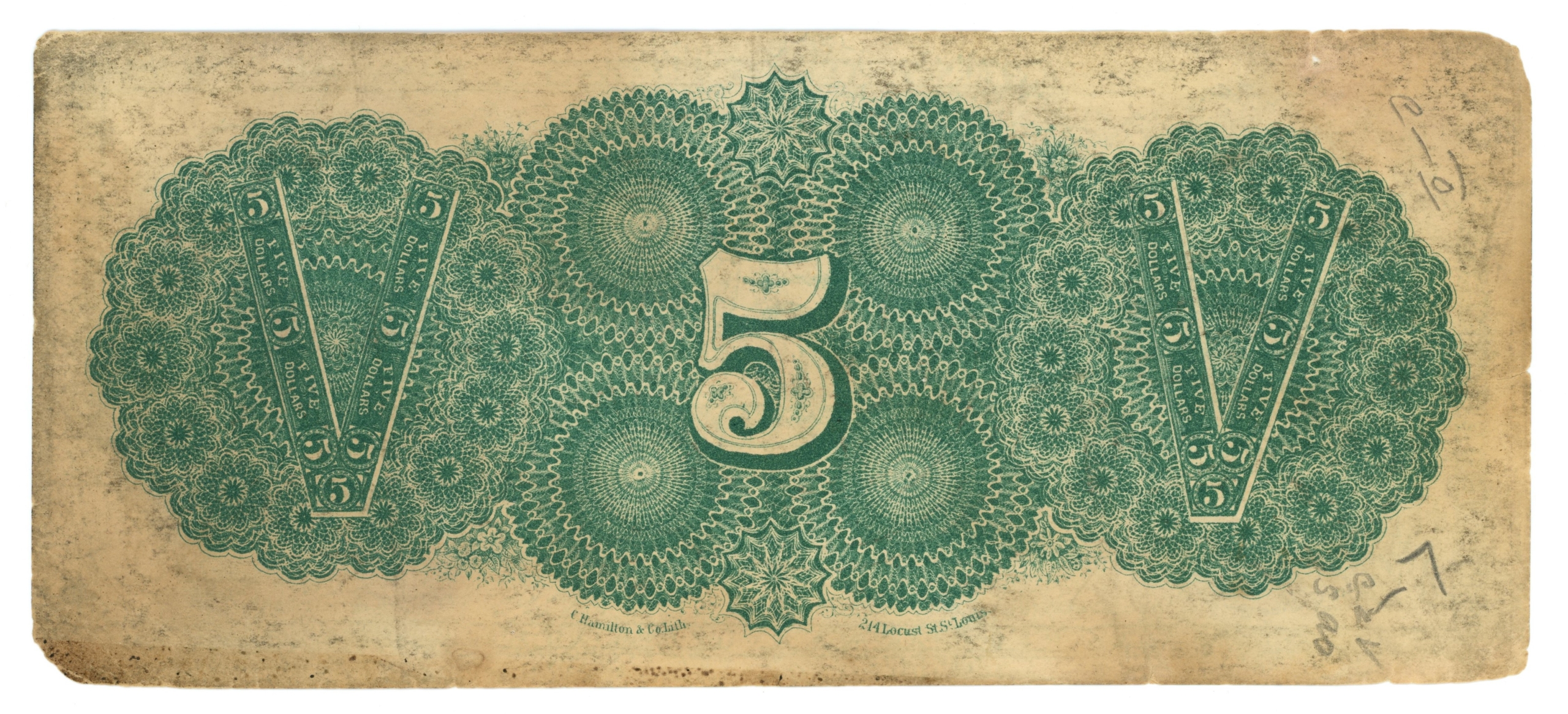 Note has edge tears and pinholes. Previously hinged/mounted. Annotations on the front and back of the note. Embossed stamp.