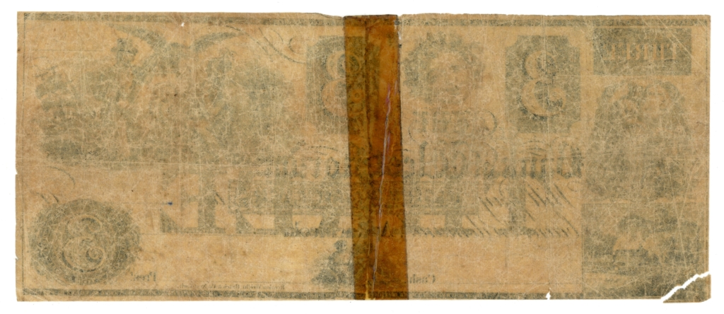 Benice 9 (Rarity 6). Remainder. Note is severed and reattached. Bottom left corner is detached from the note. Very fragile. Note adheres to the surface it is in contact with. Pinholes and smaller tears present.