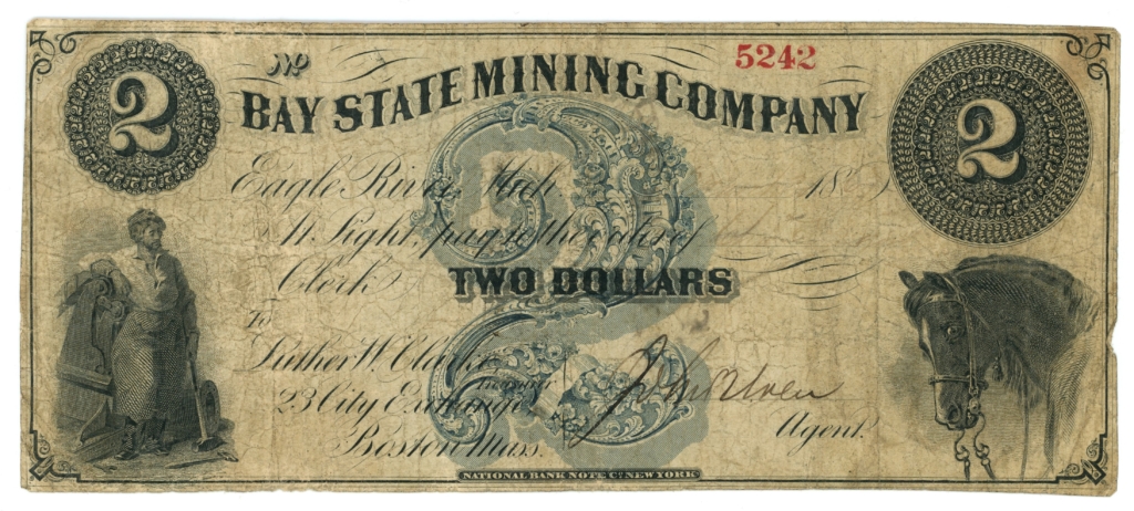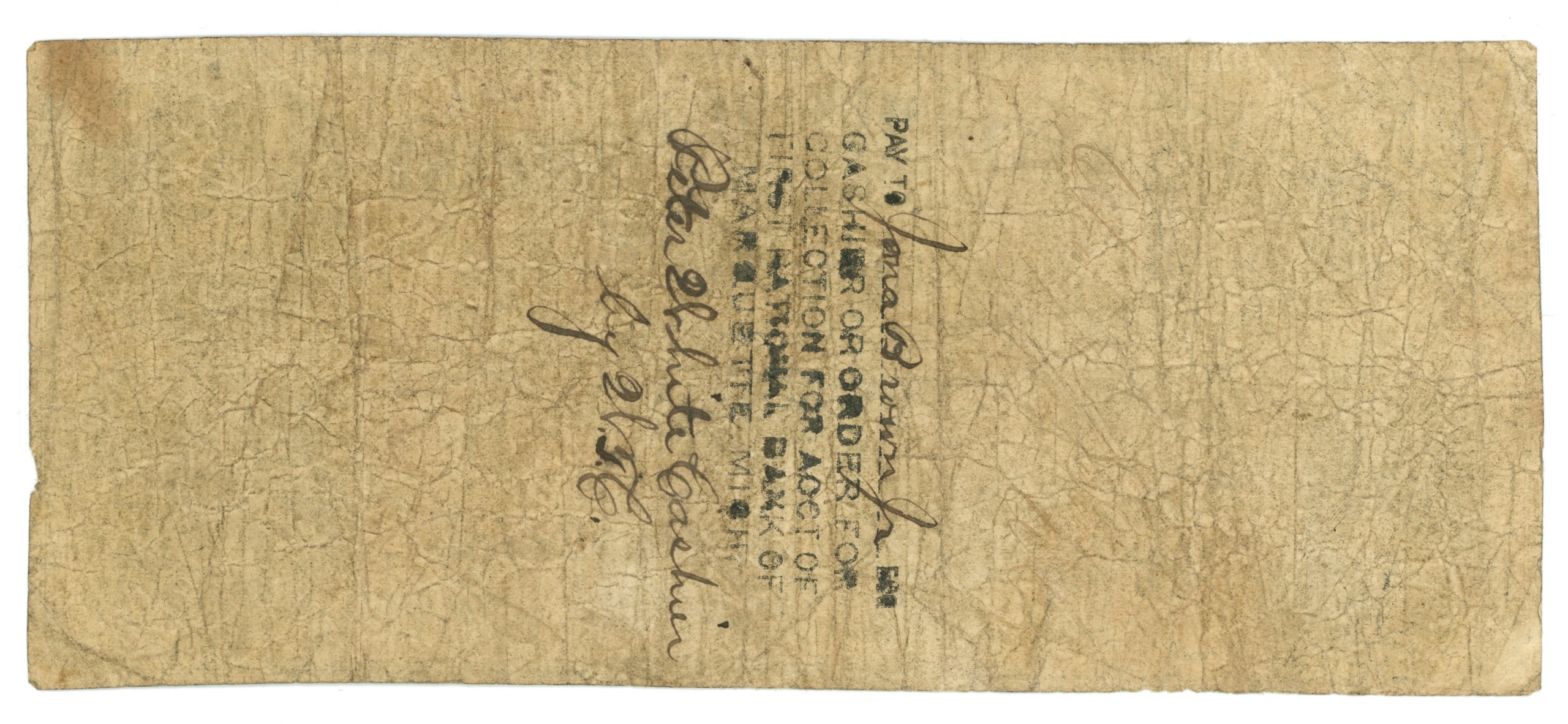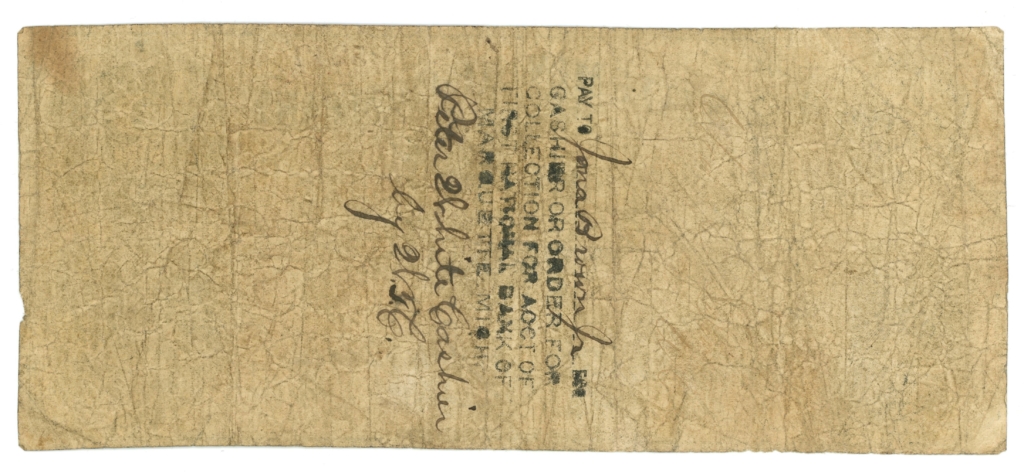 First National Bank of Marquette Michigan stamp on the back of the note.