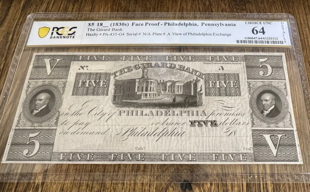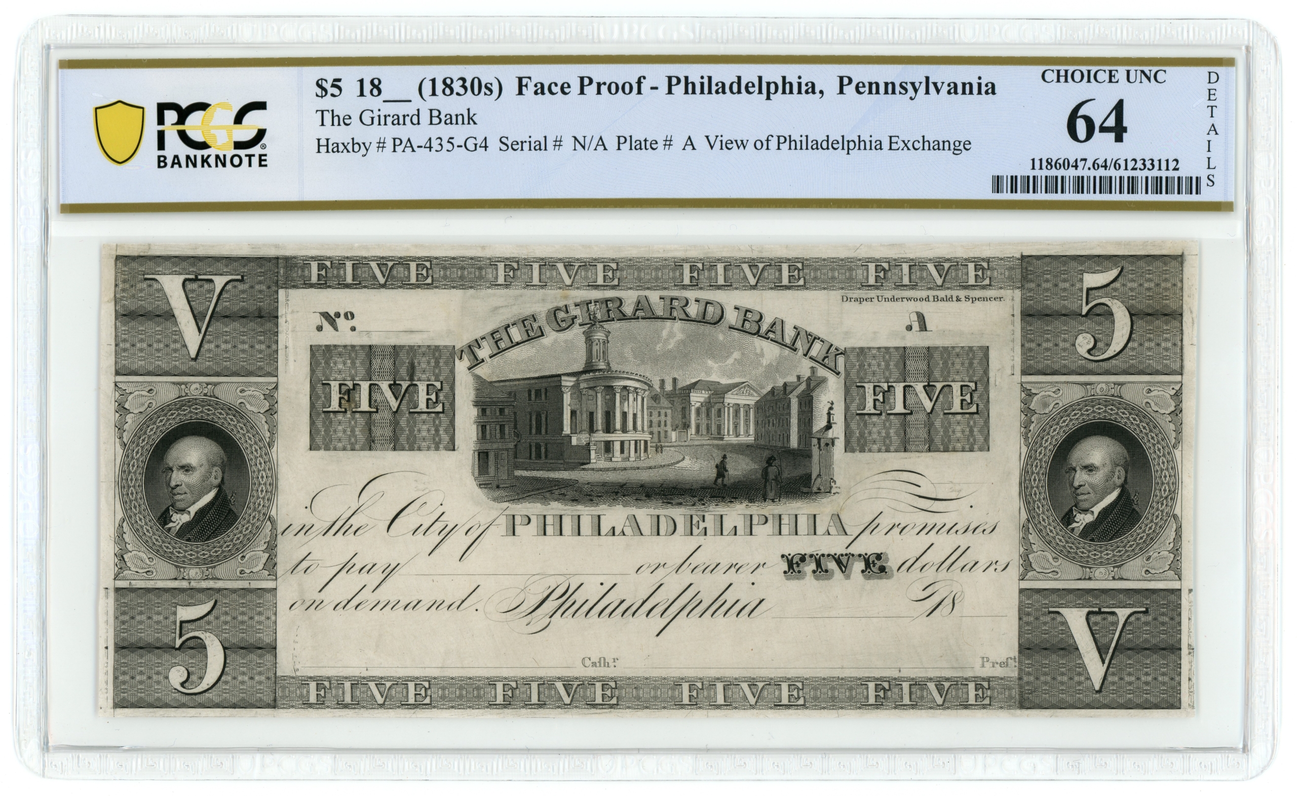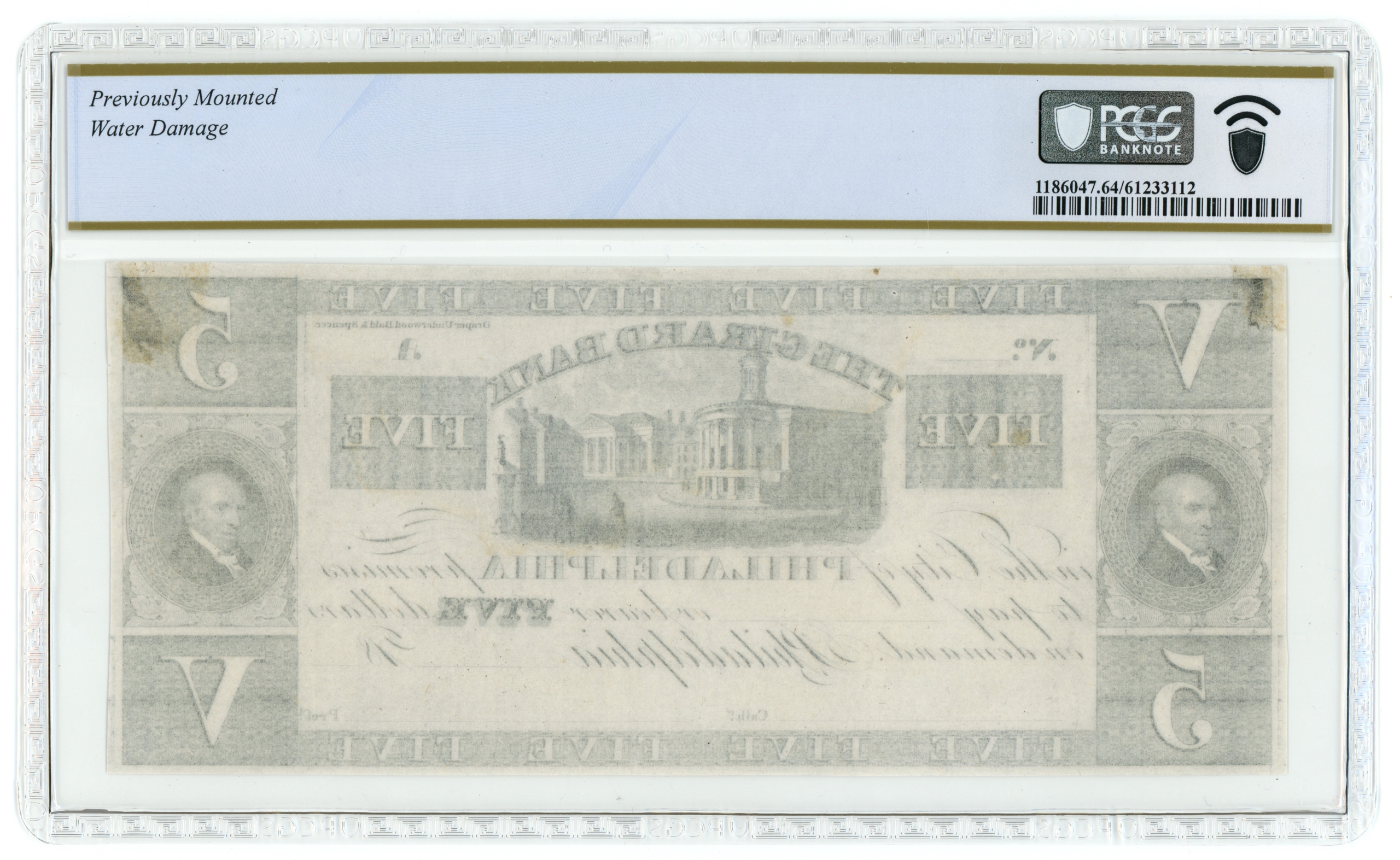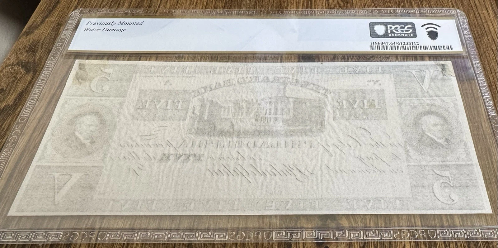 Haxby PA435-G4. Note previously mounted and has water damage as notated on the holder. See photos 3 & 4 for an accurate representation of the note in hand.