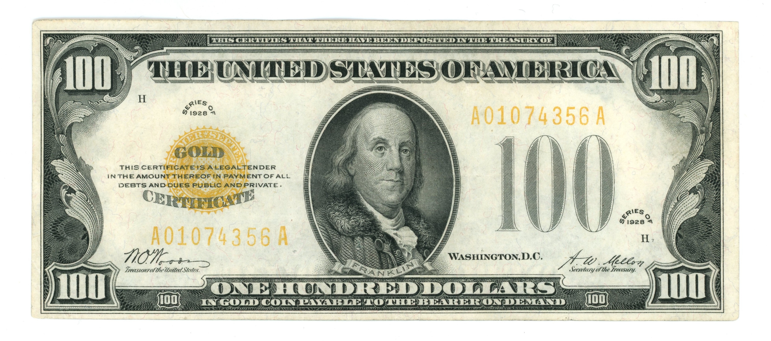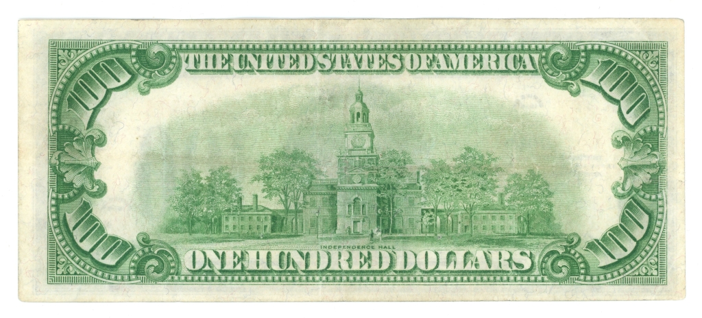 Small pinhole below and to the right of the last prefix in the left serial number. Small pinhole on Franklin’s right collar. Closed pinhole above the I in Washington D.C.