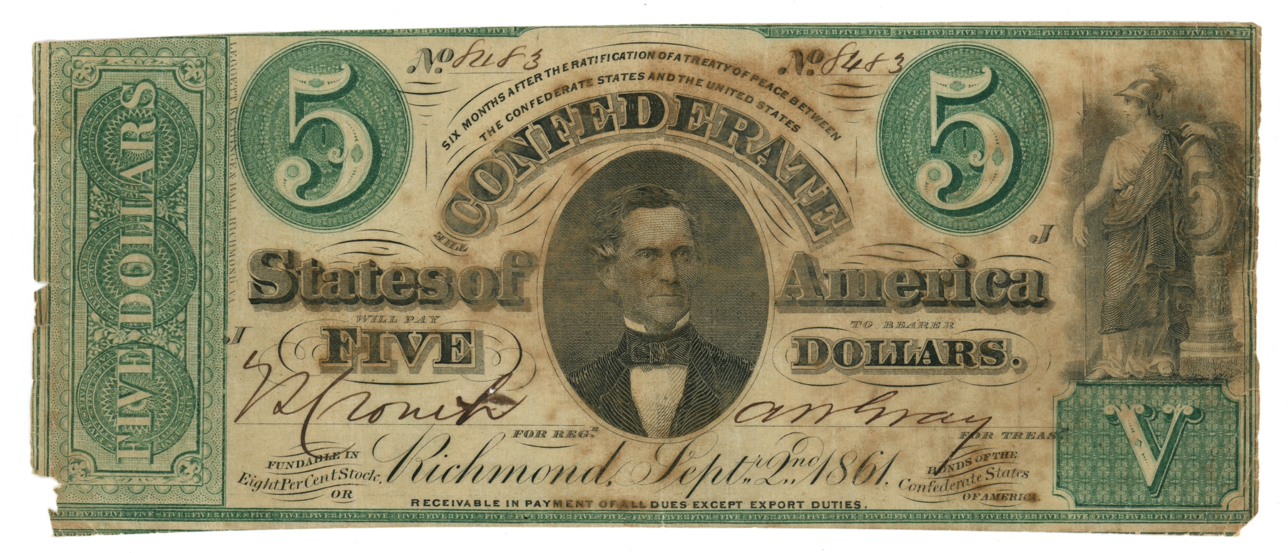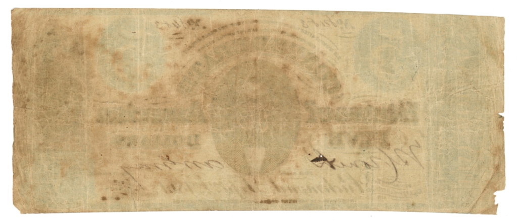 Not canceled. Note has stains. Bottom left corner missing. Ink erosion and small edge tears.