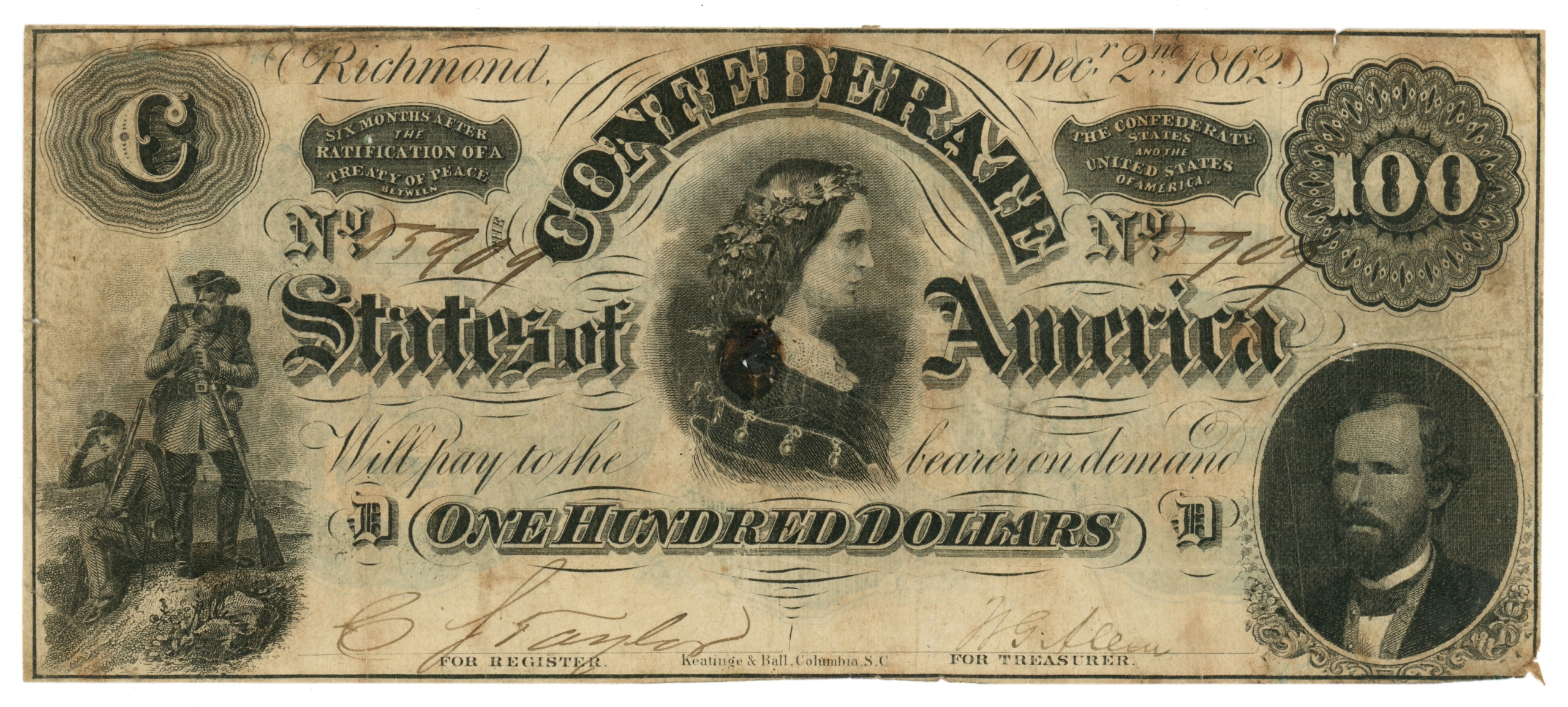Note has pinholes and edge tears. Hole & repair in the center portrait